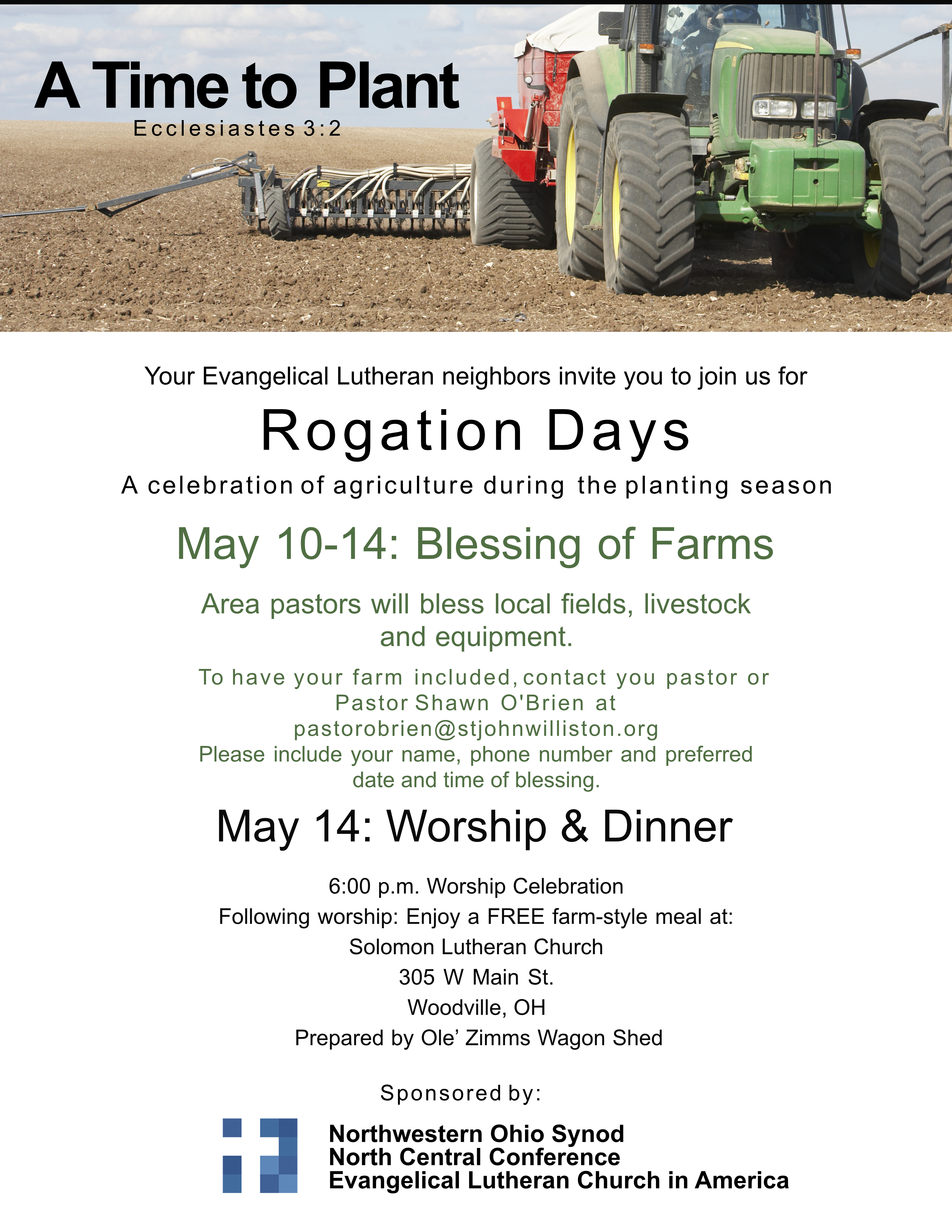 The North Central Conference of the Northwest Ohio Synod is hosting the second annual Rogation Days on May 10-14, culminating in a worship service and dinner on Ascension Day (May 14) at Solomon Lutheran Church in Woodville. Below are a host of items you can use to help with publicity in your local setting.